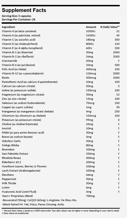 Years Plus Multi-Vitamins are intended for the BEST years! A premium 50+ Vitamin that contains a blend of vitamins, minerals, herbs and superfoods to help with health specific to 50+ aged individuals. Vision, memory, sexual and hormonal support, energy, immunity and more!